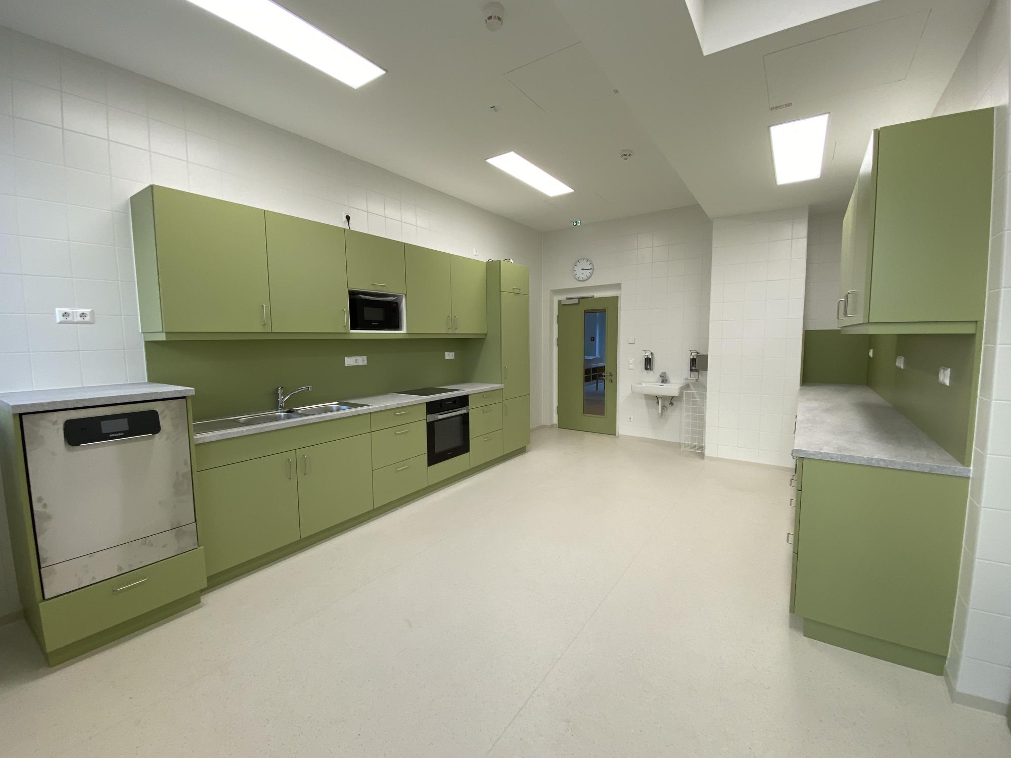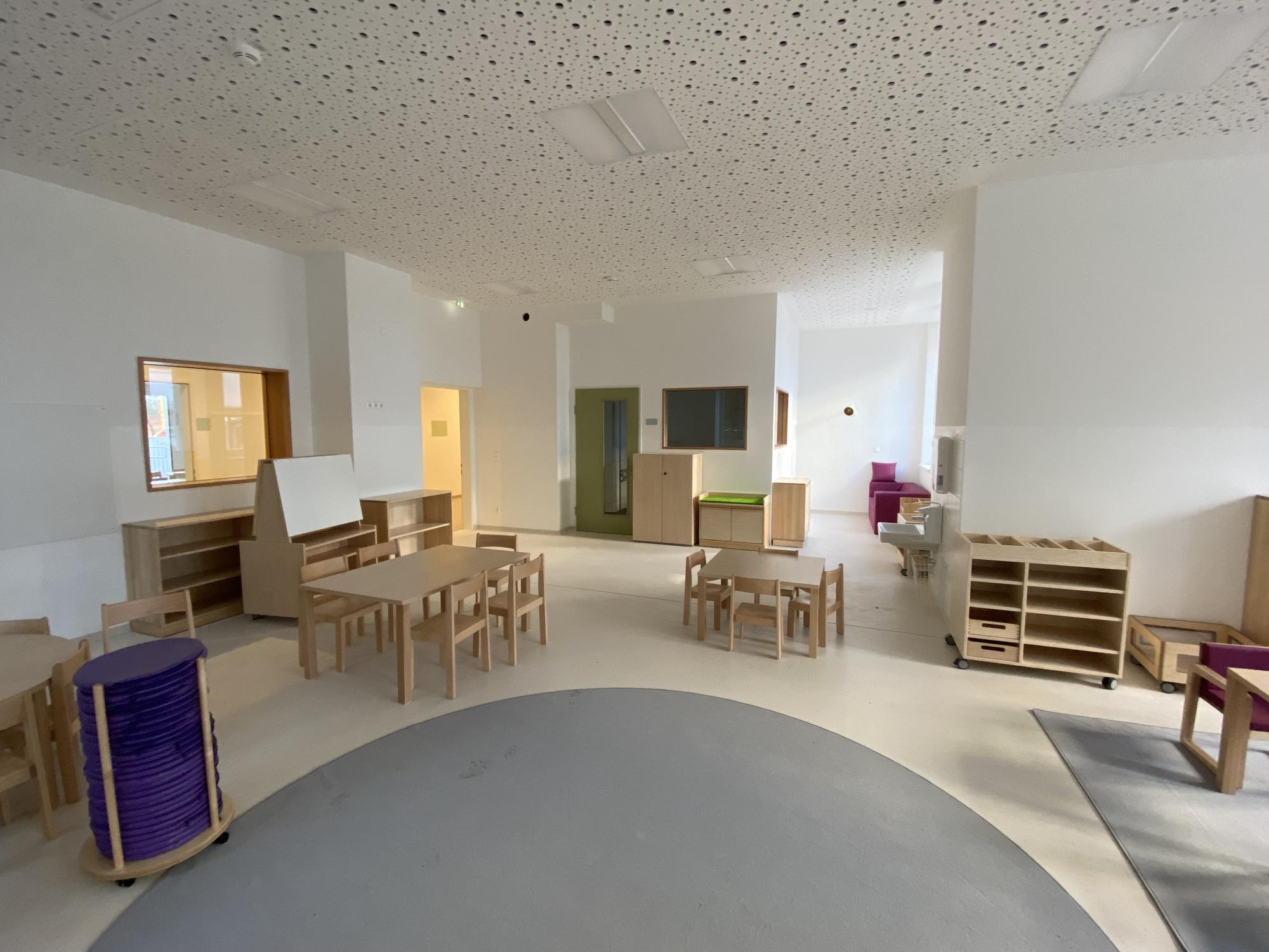 Im eingeschossigen Kellergeschoss befinden sich Haustechnik, Lagerräume, Garderoben, Sanitäranlagen und die Büroräume des Kindergartens. Ein umlaufender Lichtgraben sorgt für Tageslicht im Untergeschoß. Das Erdgeschoss beherbergt den zentralen Eingang mit Stiegenhaus, Gruppenräume, Garderoben, Sanitärbereiche, Sozialräume sowie eine Küche. Im ersten Obergeschoss ist die Hälfte der Fläche dem Kindergarten zugeordnet, der baulich von den Verwaltungsbereichen des Krankenhauses getrennt ist. Die Dachflächen werden nicht genutzt und sind nur zu Wartungszwecken begehbar.
