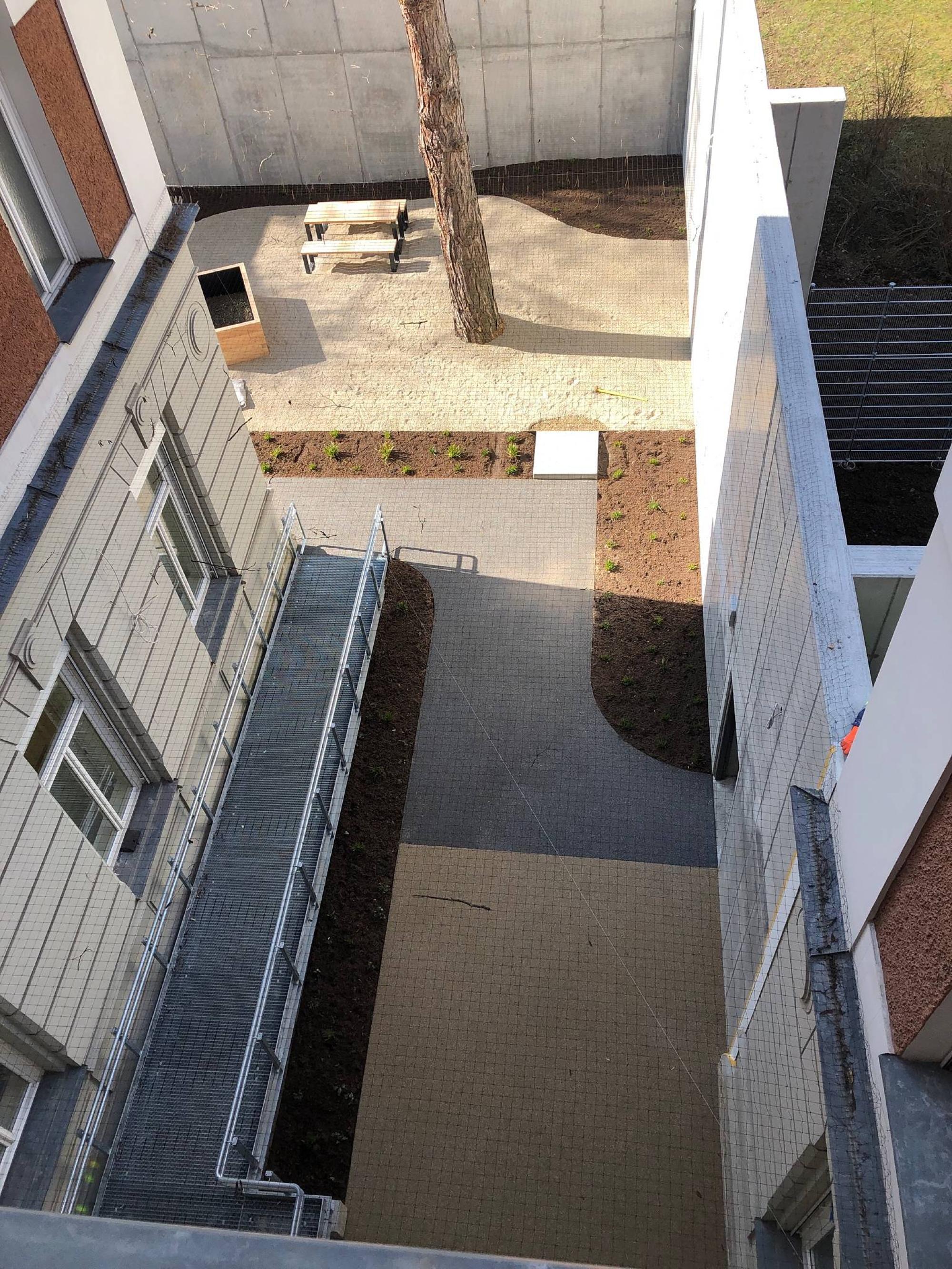 Im Kellergeschoss sind Technik- und Lagerräume, im Erdgeschoss die Station mit Patientenzimmern, Aufenthalts- und Therapieräumen sowie zugehörigen Funktionsbereichen. Im ersten Obergeschoss befinden sich Personalgarderoben und Nebenräume ohne Patientenverkehr. Zusätzlich gibt es gesicherte Außenbereiche mit Patientengärten.